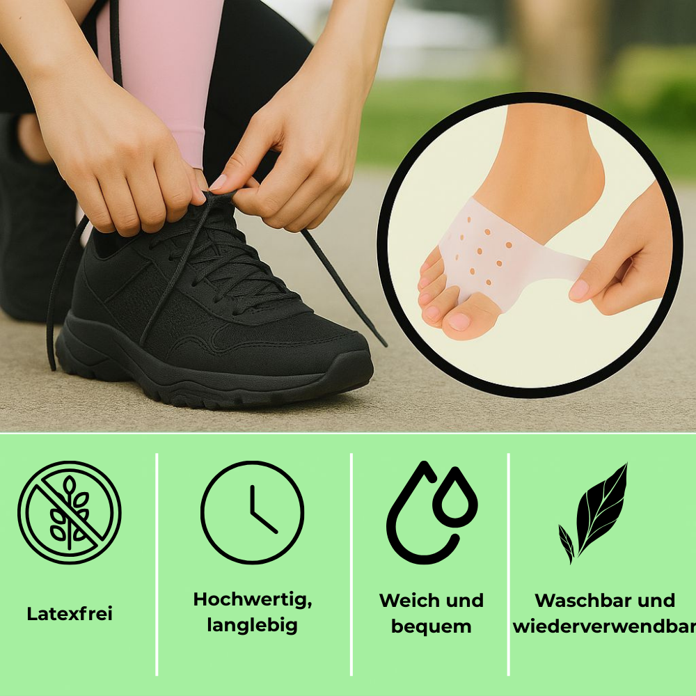 Das medizinische Silikon passt sich optimal an, reduziert Reibung und beugt Druckstellen vor – ideal für Menschen, die viel stehen oder laufen. Eine einfache, aber hochwirksame Lösung für gesunde, schmerzfreie Füße.“